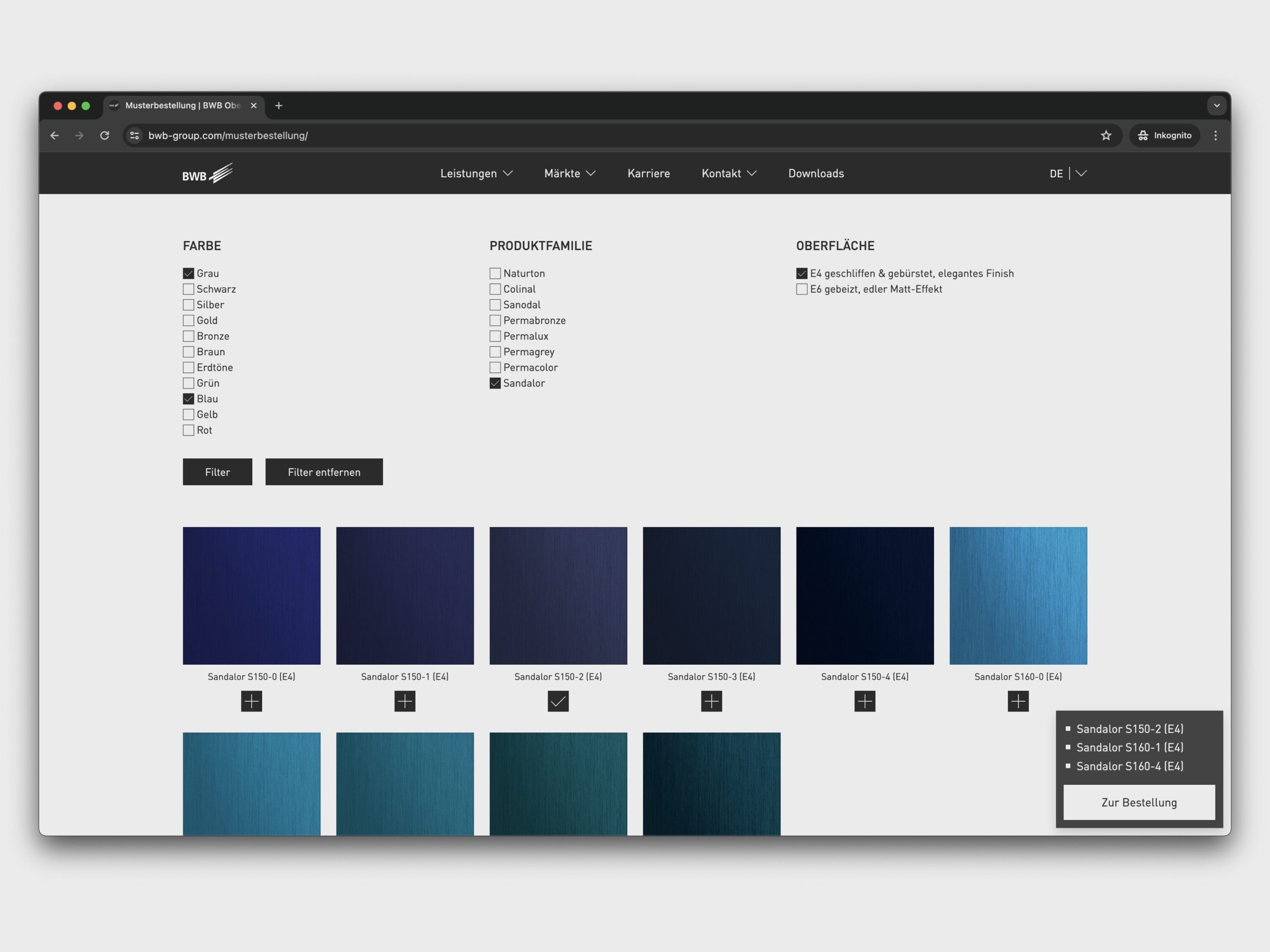 Besonders herausfordernd war die Implementierung des Oberflächen-Konfigurators und der Farbmuster-Bestellseite: