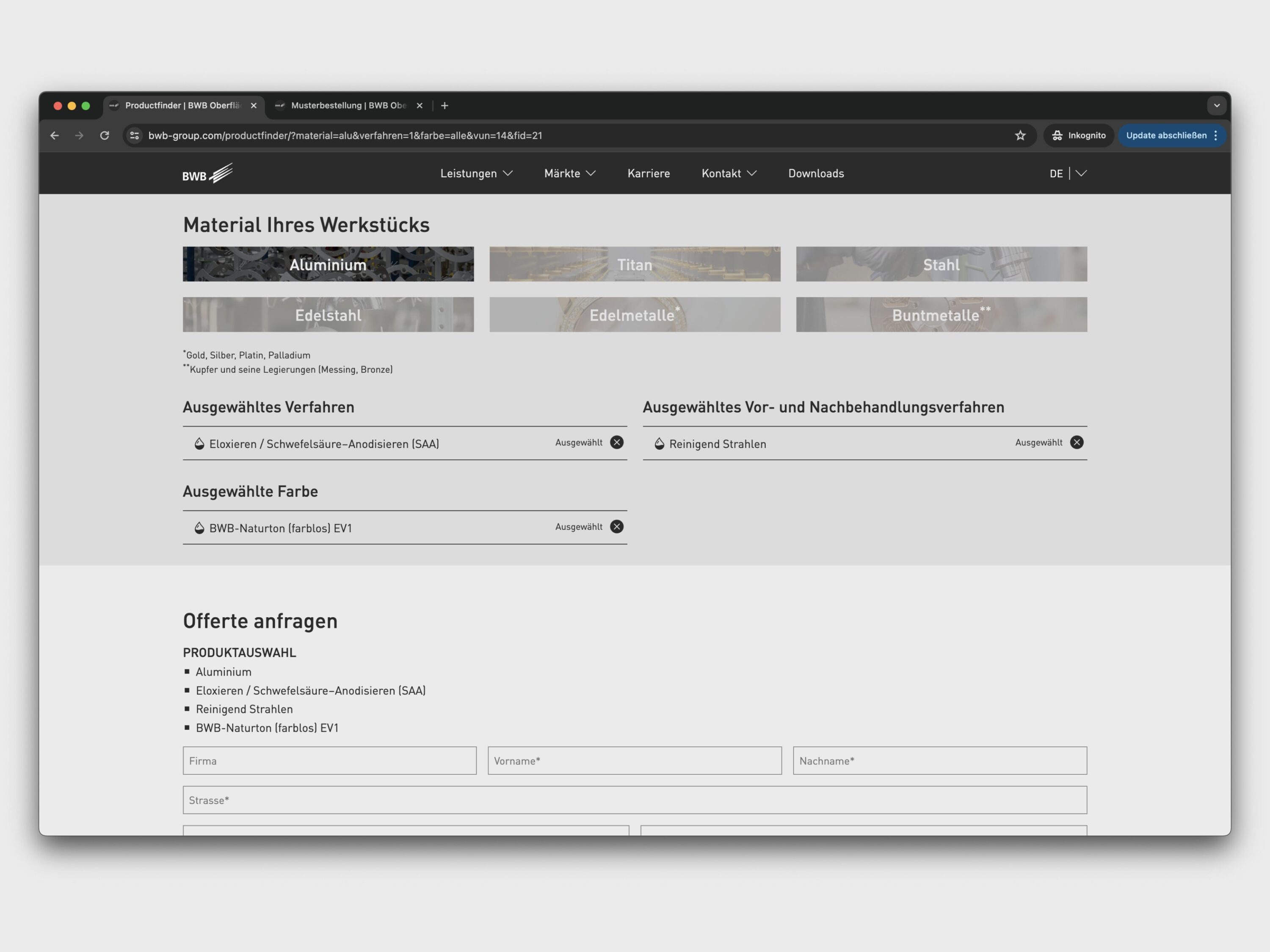 Im Produktkonfigurator sollten alle Dienstleistungen der Unterseiten in einem Prozess dargestellt werden, um Kunden die Möglichkeit einer Offertanfrage zu bieten. Da alle Dienstleistungen bereits im Backend erfasst waren, ging es konkret darum, diese Informationen über diverse Attribute zu steuern. Abhängig von Material oder Behandlungsverfahren gelangt der Kunde zu einer anderen Dienstleistung.
