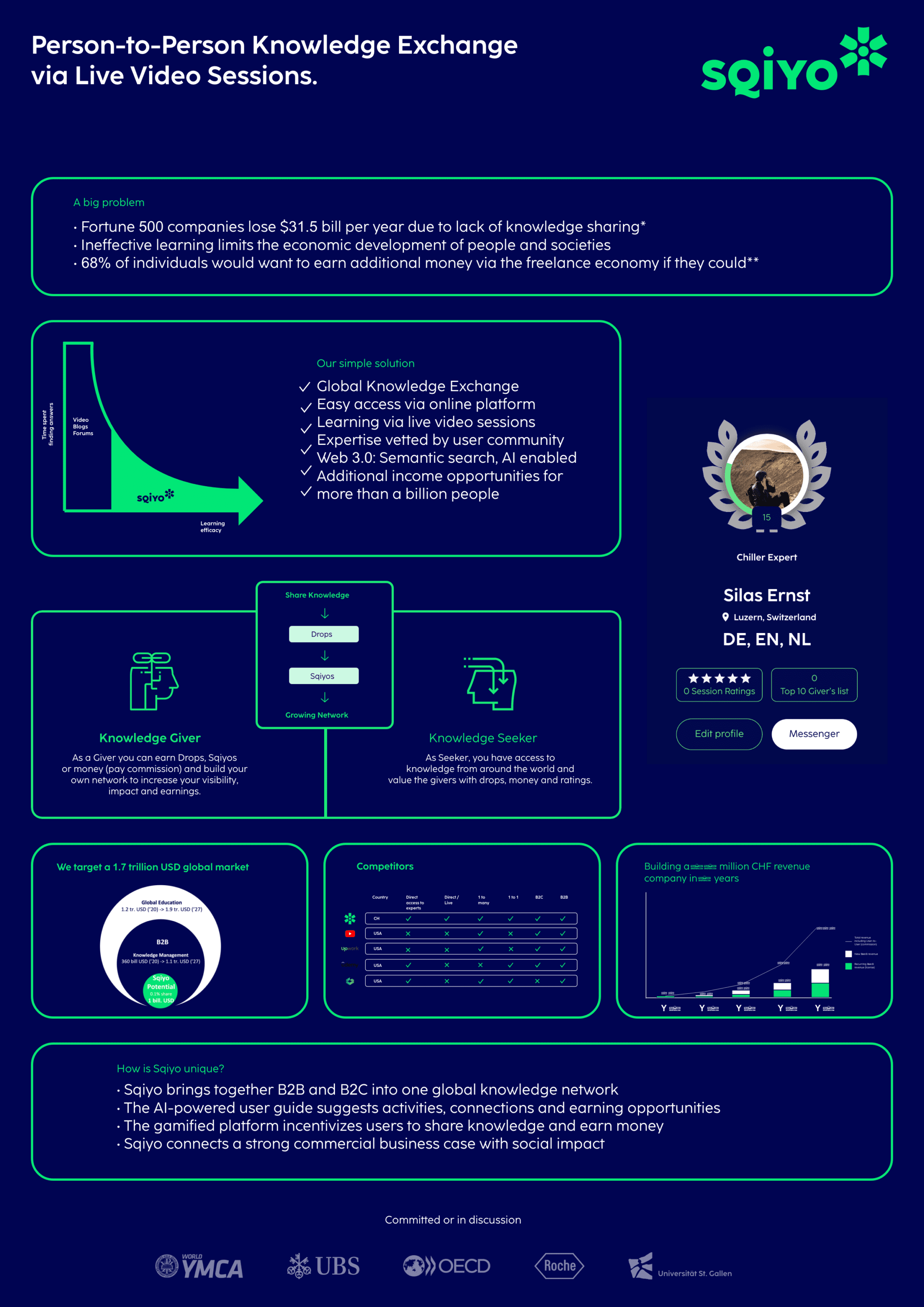 Ich durfte Sqiyo in der Gründungsphase begleiten. Das Projekt startete als eine Plattform für den Wissensaustausch zwischen zwei Personen. Im Gegensatz zu Plattformen wie YouTube kann man auf Sqiyo direkt mit Experten über seine Herausforderungen sprechen und in einem Videoanruf Fragen stellen oder beispielsweise direktes Feedback zu persönlichen Situationen erhalten.